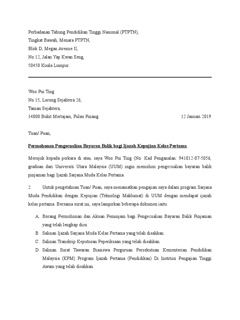 Permohonan Pengecualian Ptptn Bagi Pemegang Ijazah Kelas Pertama Pdf